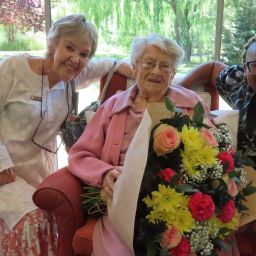 River Lodge 1 staff and residents congratulate Marie Roberts who also won a chocolate bunny.