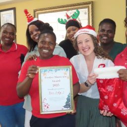 Nearby Thembalami Care Centre and the Max Ordman Deaf Association, also Rand Aid run, also received a pile of blankets. Pictured are Michelle Hurley, Stoneridge Centre’s lease administrator; marketing manager Michelle van Staden; resident Auriel Wittert; and Tarentaal social worker Lynn Barrow.