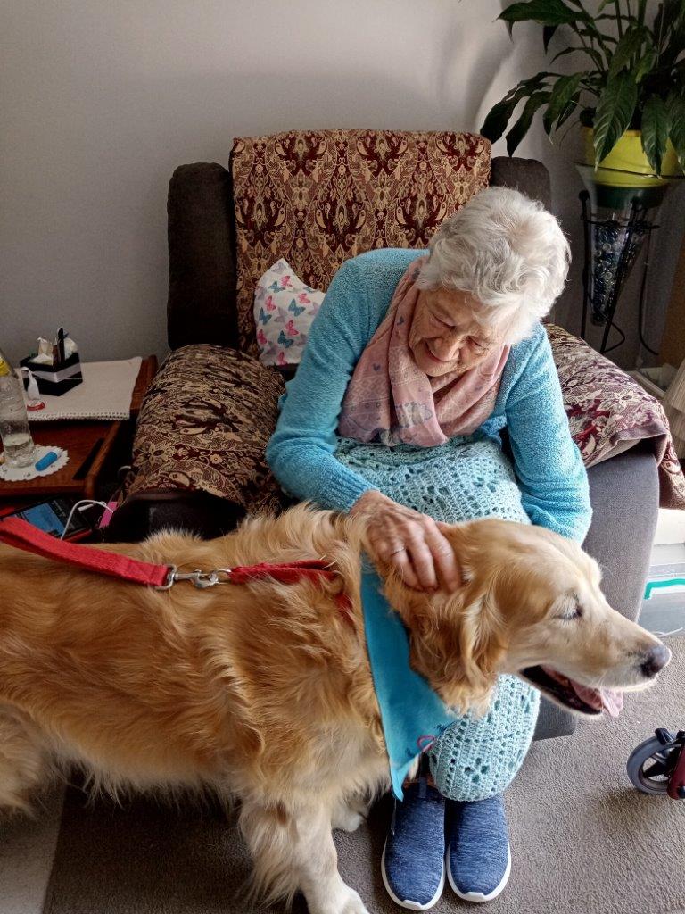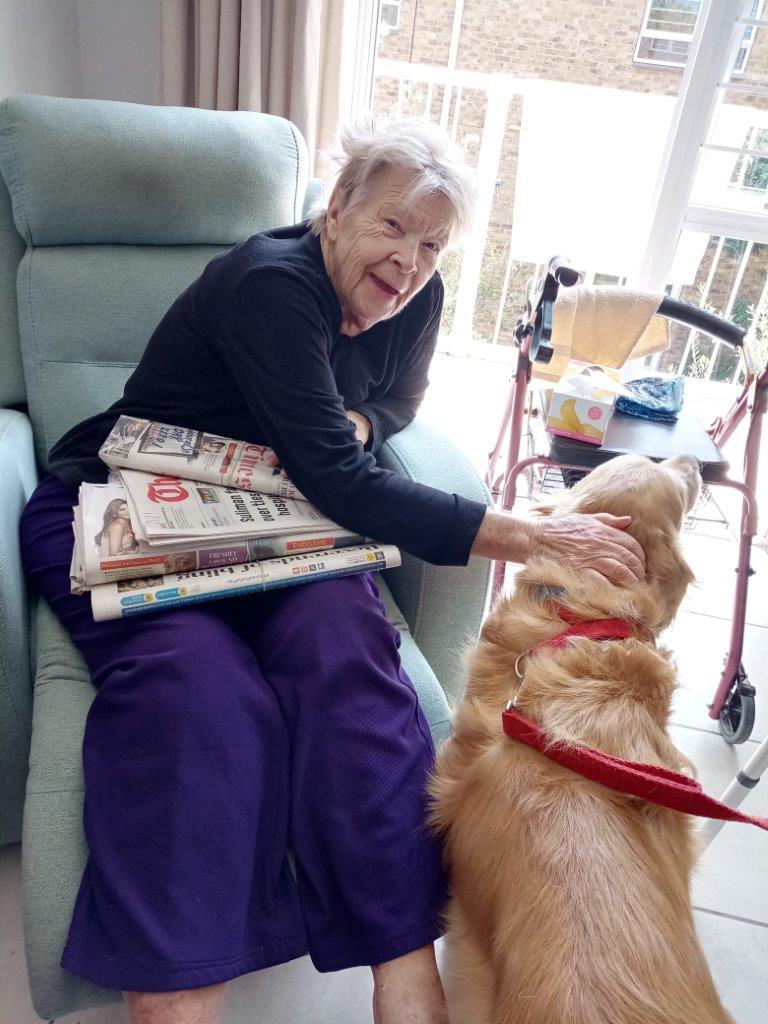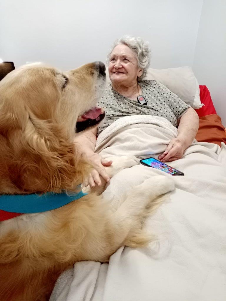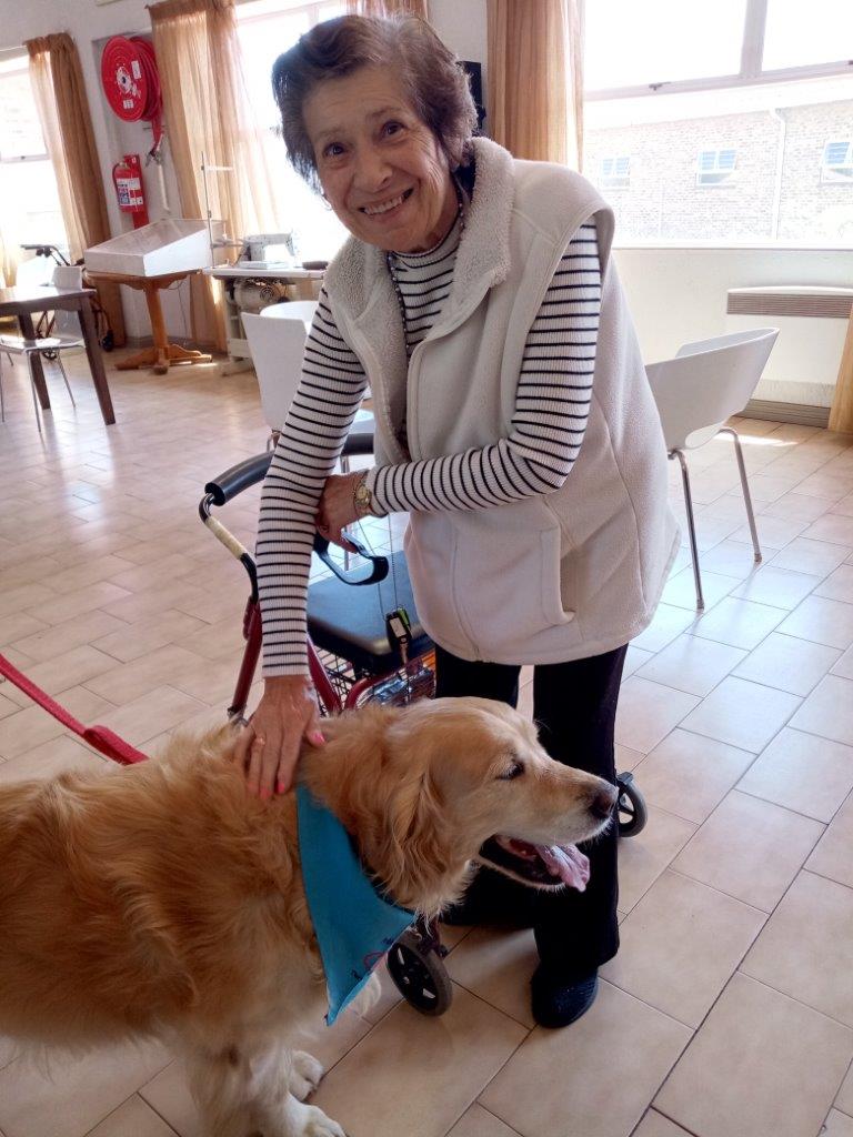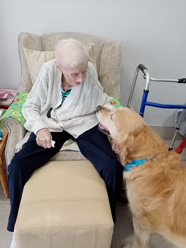 For those unable to join the group in the garden, the dogs made their way to individual rooms. Roslyn Cronin received a bedside visit from Chase, bringing a bright smile to her face as they interacted. Josephine Baylis, Isabella Keylock and Eunice de Jager also spent quality time with Chase, with the golden retriever providing much-appreciated companionship. Alice Jardim was seen beaming with delight while greeting the dogs during their rounds through the centre.
